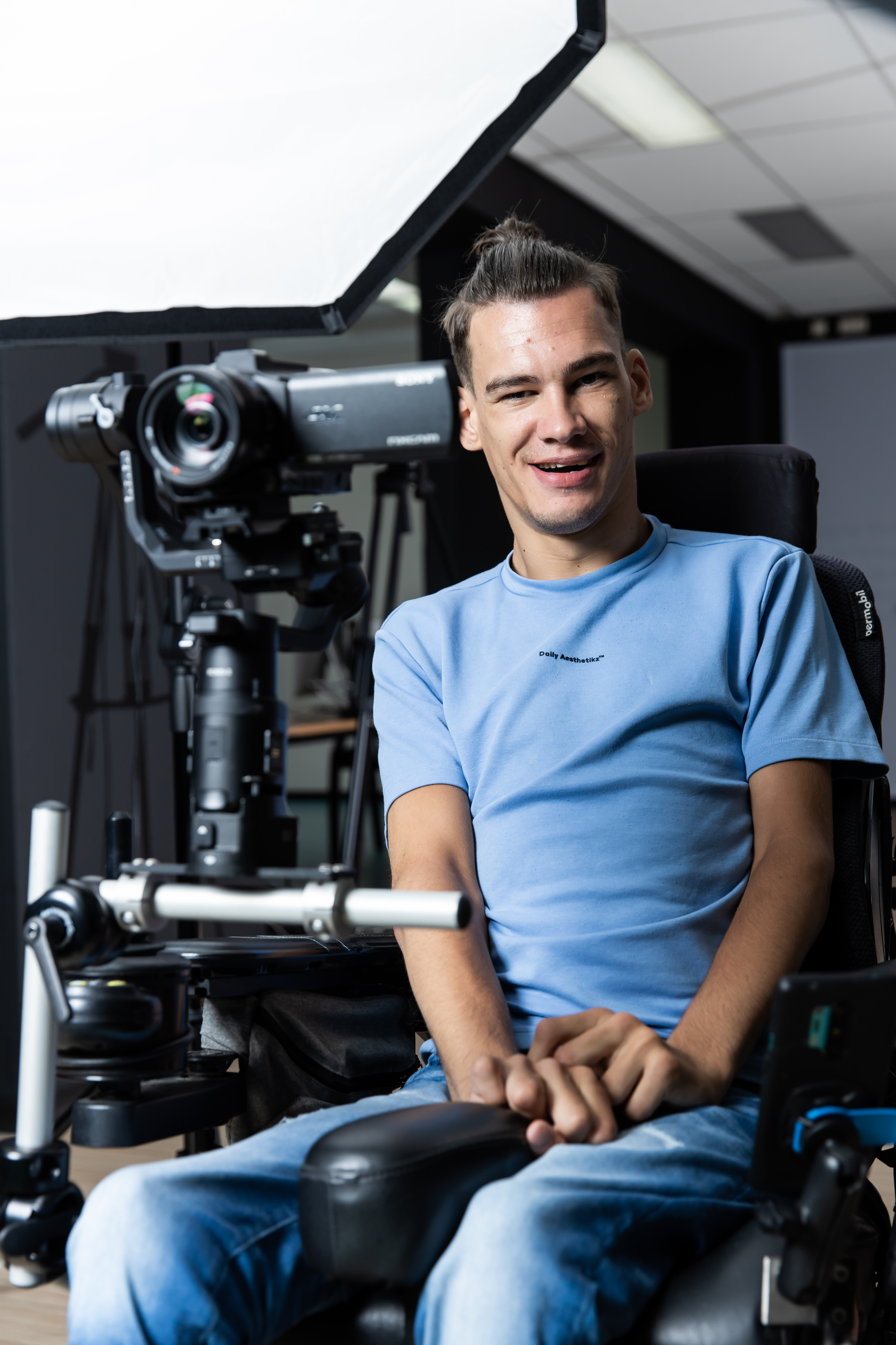 Dankzij een camera-opbouw op zijn rolstoel én een besturingsapp op zijn telefoon bedient hij de professionele camera. Dat doet hij met de joystick van zijn rolstoel. Voor het editen van de films gebruikt hij naast de joystick ook oogbediening en speciale knoppen bij zijn voeten.