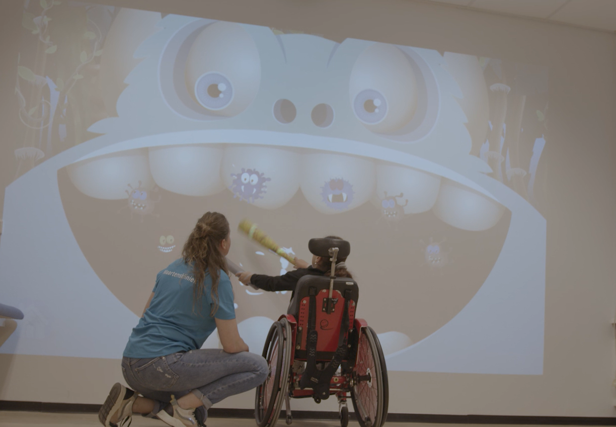 Er zijn veel verschillende spellen beschikbaar voor de speelmuur. Ook kunnen we er de loopband of fietstrainer aan koppelen. Daardoor kan elk kind gericht oefenen met de interactieve muur. Ieder spel lokt namelijk weer andere bewegingen uit. Met de speelmuur trainen kinderen makkelijker meerdere vaardigheden tegelijk. De kinderen gaan zo op in een spel dat ze niet in de gaten hebben dat ze aan het oefenen zijn. Hierdoor wordt de revalidatie effectiever. Alle zorgverleners die betrokken zijn bij de revalidatiebehandeling, maken gebruik van de speelmuur. De logopediste zet de muur in om de taalontwikkeling te stimuleren en de ergo- en fysiotherapeuten voor het oefenen van de motoriek, balans, spierkracht en de arm- handfunctie.