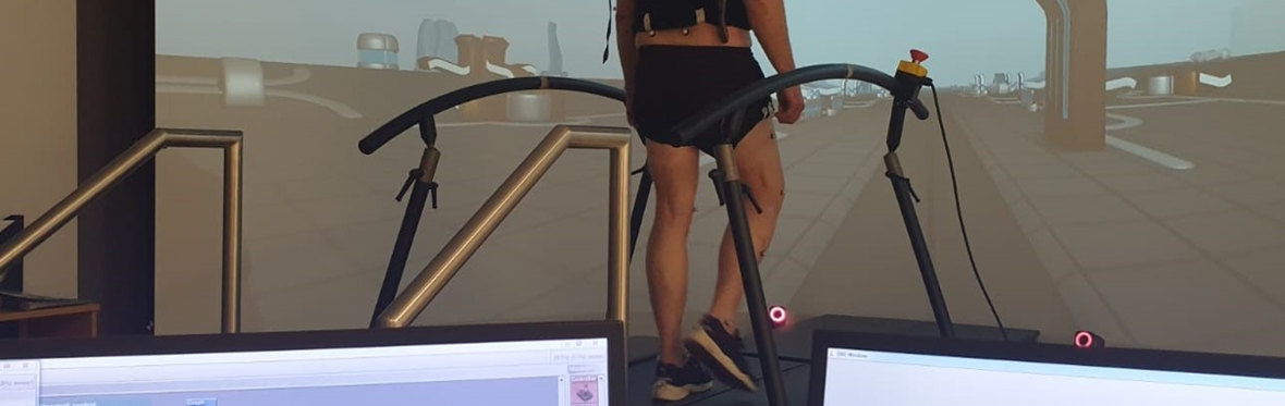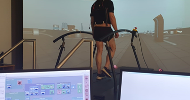 We will measure gait at home using wearable sensors, and in the clinic on the GRAIL, an advanced treadmill (see image). On this treadmill we will investigate gait during different conditions: level walking, walking on slopes, and during balance perturbations.